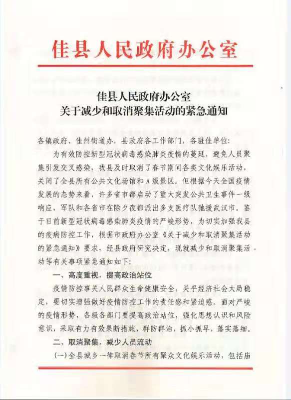 佳縣人民政府關(guān)于減少和取消聚集活動(dòng)的緊急通知